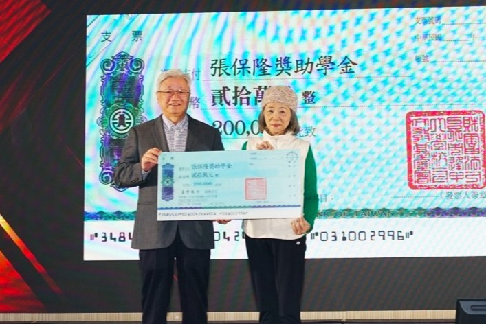 由基金會鍾智文董事長代表致贈母校張保隆校長紀念獎助學金20萬,由張保隆前校長夫人王淑嫻女士代表受贈。